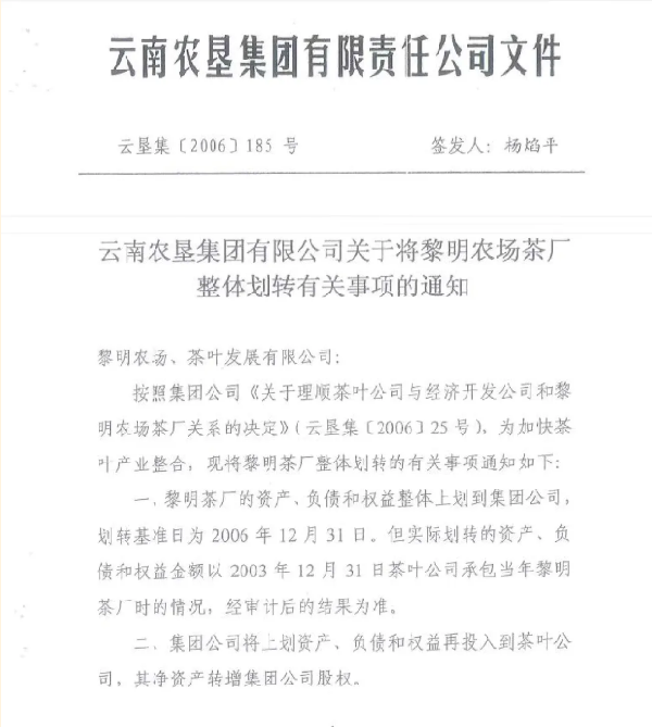 2006年云南農(nóng)墾集團(tuán)有限公司為整合內(nèi)部茶產(chǎn)業(yè)資源,謀求茶產(chǎn)業(yè)做強(qiáng)做優(yōu),將黎明茶廠整體上劃至云南農(nóng)墾茶葉發(fā)展有限公司。