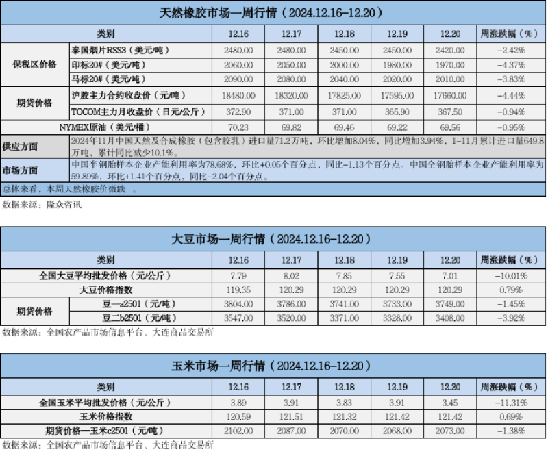 天然橡膠、大豆、玉米市場一周行情(2024.12.16-12.20)