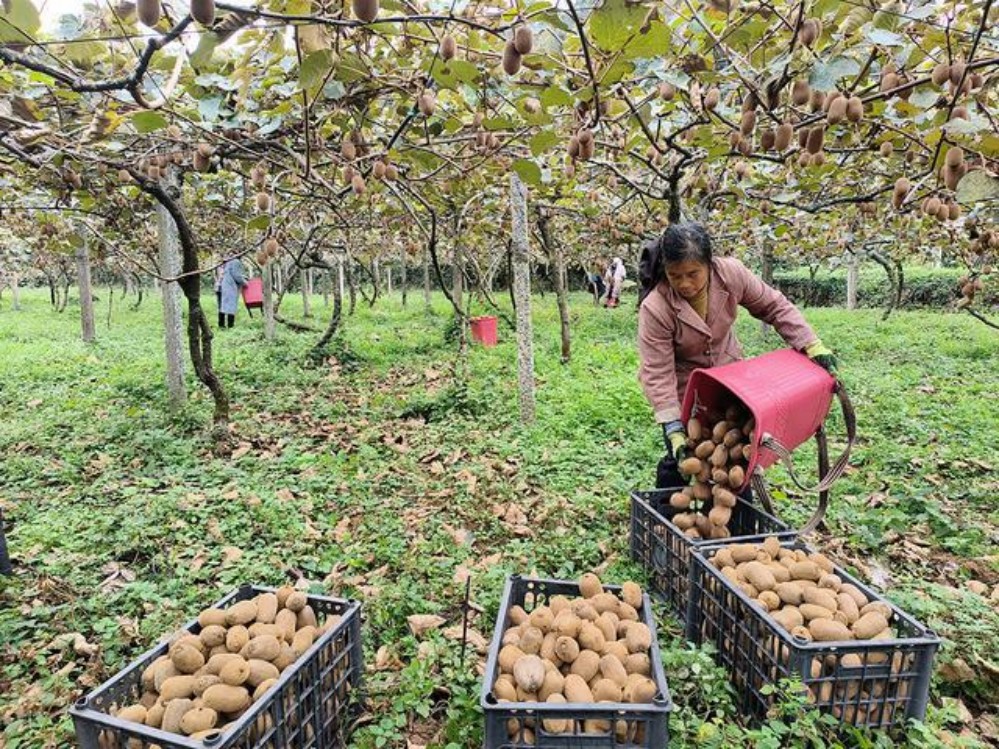“果園的獼猴桃大豐收了,我們給老板摘獼猴桃,一天要摘1000多斤?!眲?wù)工群眾唐順憲說(shuō)。