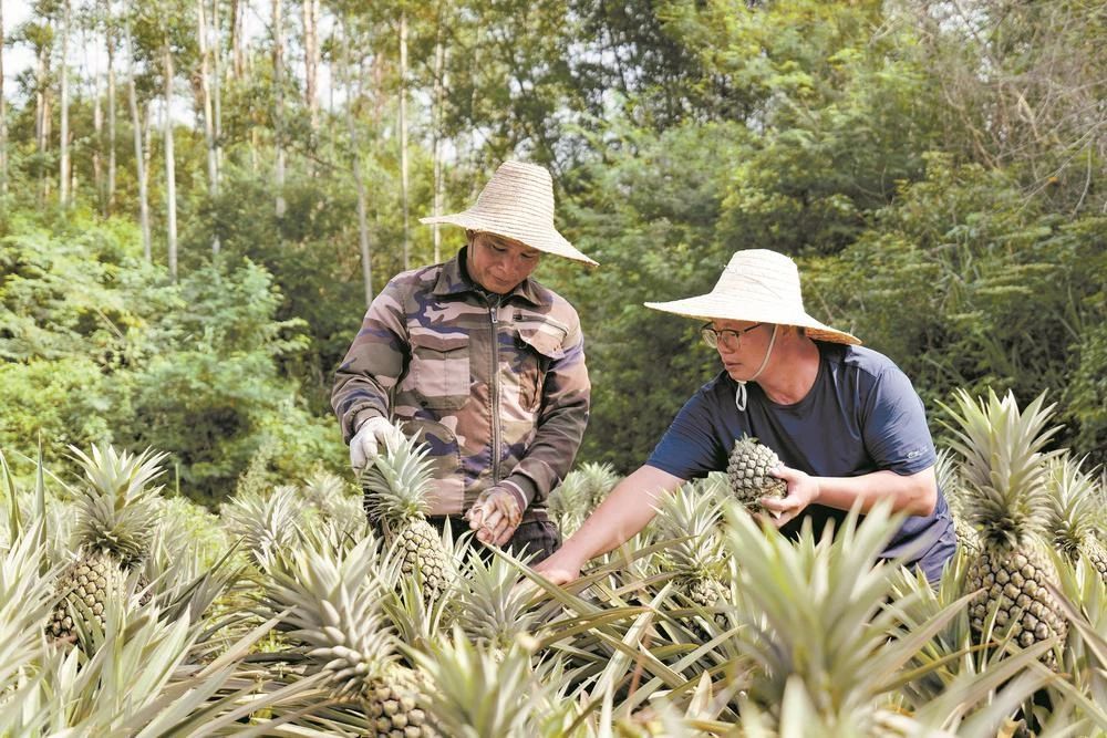 7月18日,記者走進(jìn)該種植基地,只見(jiàn)一茬茬鳳梨長(zhǎng)勢(shì)喜人。飽滿(mǎn)碩大的鳳梨頭頂綠纓,果實(shí)挺立于層層葉子之上,微風(fēng)拂過(guò),空氣中彌漫著陣陣?guó)P梨清香。地頭,種植戶(hù)凌長(zhǎng)恩和村民正忙碌而有序地進(jìn)行采摘、分揀、裝箱,臉上洋溢著豐收的喜悅。