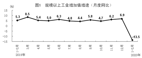 1-2月份,規(guī)模以上工業(yè)增加值同比下降13.5%。分經(jīng)濟(jì)類型看,國(guó)有控股企業(yè)增加值下降7.9%;股份制企業(yè)下降14.2%,外商及港澳臺(tái)商投資企業(yè)下降21.4%;私營(yíng)企業(yè)下降20.2%。分三大門類看,采礦業(yè)增加值下降6.5%,制造業(yè)下降15.7%,電力、熱力、燃?xì)饧八a(chǎn)和供應(yīng)業(yè)下降7.1%。從產(chǎn)品產(chǎn)量看,醫(yī)療防護(hù)和生活所需物資增長(zhǎng)較快,口罩、發(fā)酵酒精產(chǎn)量分別增長(zhǎng)127.5%和15.6%,凍肉和方便面分別增長(zhǎng)13.5%和11.4%。高技術(shù)產(chǎn)品增勢(shì)良好,智能手表、智能手環(huán)、半導(dǎo)體分立器件和集成電路產(chǎn)量分別增長(zhǎng)119.7%、45.1%、31.4%和8.5%。基本原材料生產(chǎn)平穩(wěn),生鐵、粗鋼、平板玻璃、十種有色金屬產(chǎn)量分別增長(zhǎng)3.1%、3.1%、2.3%和2.2%。全國(guó)采購(gòu)經(jīng)理調(diào)查數(shù)據(jù)結(jié)果顯示,截至2月25日,大中型制造業(yè)企業(yè)復(fù)工率達(dá)到85.6%,生產(chǎn)經(jīng)營(yíng)活動(dòng)正有序恢復(fù)。