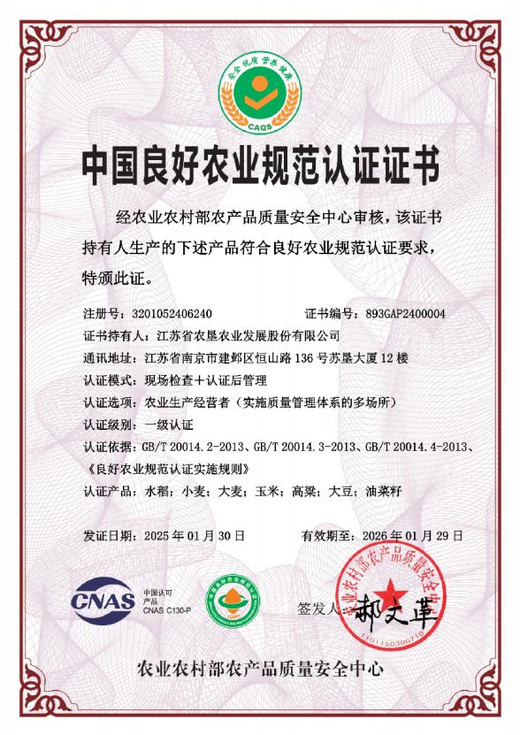 2024年,蘇墾農(nóng)發(fā)為強(qiáng)化農(nóng)產(chǎn)品生產(chǎn)全過(guò)程的質(zhì)量與安全管理,提高種植基地農(nóng)業(yè)生產(chǎn)標(biāo)準(zhǔn)化、規(guī)范化和可持續(xù)發(fā)展水平,認(rèn)證并通過(guò)了20家種植基地水稻、小麥、大麥、玉米、大豆、油菜、高粱等7種作物的全國(guó)良好農(nóng)業(yè)規(guī)范(GAP)一級(jí)認(rèn)證,率先通過(guò)農(nóng)業(yè)農(nóng)村部農(nóng)產(chǎn)品質(zhì)量安全中心良好農(nóng)業(yè)規(guī)范(GAP)質(zhì)量管理體系的多場(chǎng)所認(rèn)證,是全國(guó)單體規(guī)模最大的一級(jí)認(rèn)證單位。一年來(lái),公司依托全產(chǎn)業(yè)鏈縱向一體化管理優(yōu)勢(shì),對(duì)種植基地生產(chǎn)環(huán)境質(zhì)量、投入品使用、農(nóng)產(chǎn)品質(zhì)量控制等方面進(jìn)行嚴(yán)格規(guī)范化管理,全面提升農(nóng)業(yè)生產(chǎn)標(biāo)準(zhǔn)化、規(guī)范化管理水平,為公司農(nóng)業(yè)生產(chǎn)可持續(xù)發(fā)展提供了保障。