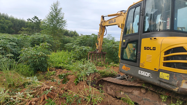 工人開勾機采挖木薯。