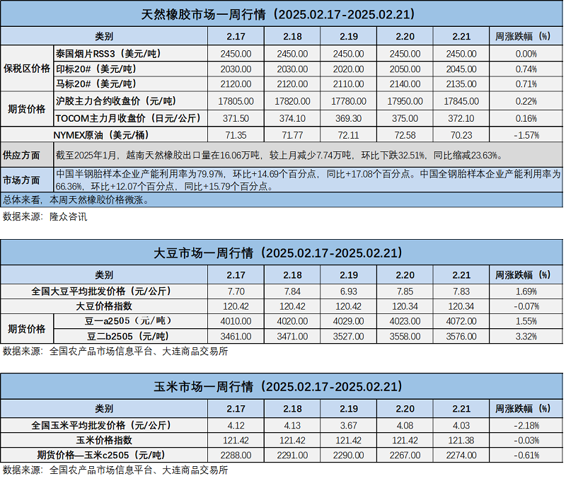 天然橡膠、大豆、玉米市場(chǎng)一周行情(2025.02.17-02.21)