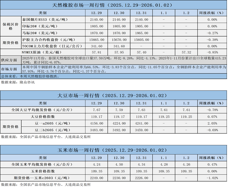 天然橡膠、大豆、玉米市場(chǎng)一周行情(2025.12.29-2026.01.02)