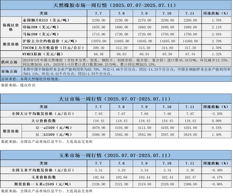 天然橡膠、大豆、玉米市場一周行情(2025.07.07-07.11)