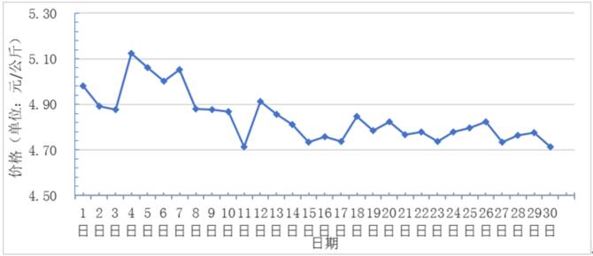 9月,全國重點監(jiān)測農(nóng)產(chǎn)品批發(fā)市場香蕉總交易量達9.1萬噸,同比上漲8.3%,環(huán)比上漲5.8%;總交易價值 41441.1萬元,同比上漲12.5%,環(huán)比下降1.1%。日平均價格最高為5.1元/千克,最低為4.7元/千克,全月平均價格為4.8元/千克,同比上漲2.1%,環(huán)比下降4%(每日價格變化如圖)。