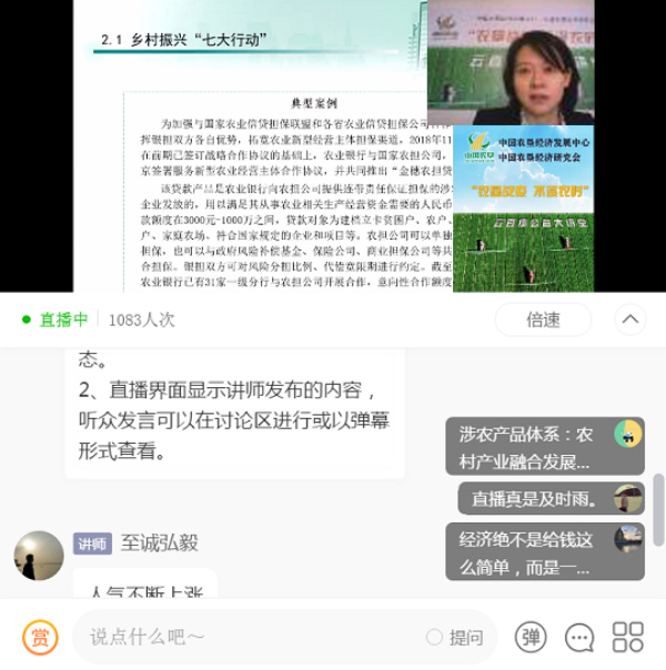 為貫徹落實(shí)中央關(guān)于統(tǒng)籌推進(jìn)新冠肺炎疫情防控和經(jīng)濟(jì)社會(huì)發(fā)展工作的部署要求,4月3日上午,由中國(guó)農(nóng)墾經(jīng)濟(jì)發(fā)展中心、中國(guó)農(nóng)墾經(jīng)濟(jì)研究會(huì)主辦的“農(nóng)墾戰(zhàn)疫 不誤農(nóng)時(shí)”云直播公益大講堂首場(chǎng)開(kāi)講。直播由中國(guó)農(nóng)墾經(jīng)濟(jì)發(fā)展中心副主任、中國(guó)農(nóng)墾經(jīng)濟(jì)研究會(huì)秘書長(zhǎng)陳忠毅主持,邀請(qǐng)中國(guó)農(nóng)業(yè)銀行總行三農(nóng)對(duì)公業(yè)務(wù)部農(nóng)業(yè)金融處處長(zhǎng)何源源講授《“三農(nóng)”金融服務(wù)助力農(nóng)墾發(fā)展》,全國(guó)各墾區(qū)、農(nóng)場(chǎng)及相關(guān)單位人員1400余人在線觀看,反響熱烈,效果良好。