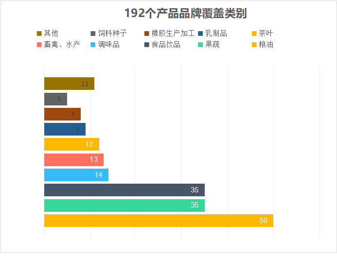 《中國(guó)農(nóng)墾品牌目錄》中,僅192個(gè)產(chǎn)品品牌其涵蓋范圍就包括糧油、果蔬、食品飲料、茶葉、乳業(yè)等多個(gè)領(lǐng)域,其中糧油類50個(gè)、果蔬類35個(gè)、食品飲料35個(gè),占所有收錄類別63%。與《中國(guó)農(nóng)業(yè)品牌目錄2019農(nóng)產(chǎn)品區(qū)域公用品牌》300個(gè)、11個(gè)門(mén)類相比,農(nóng)墾品牌全品類特征明顯。