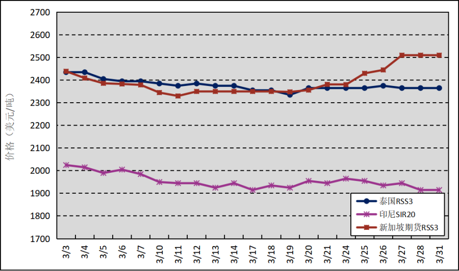 國(guó)外主產(chǎn)區(qū):3月,泰國(guó)RSS3平均價(jià)格為2378美元/噸,環(huán)比下跌70美元/噸,最高價(jià)為2435美元/噸,最低價(jià)為2335美元/噸;印尼SIR20平均價(jià)格為1954美元/噸,環(huán)比下跌30美元/噸,最高價(jià)為2025美元/噸,最低價(jià)為1915美元/噸;新加坡RSS3期貨主力合約月均結(jié)算價(jià)格為2395美元/噸,環(huán)比下跌30美元/噸,最高價(jià)為2510美元/噸,最低價(jià)為2330美元/噸。