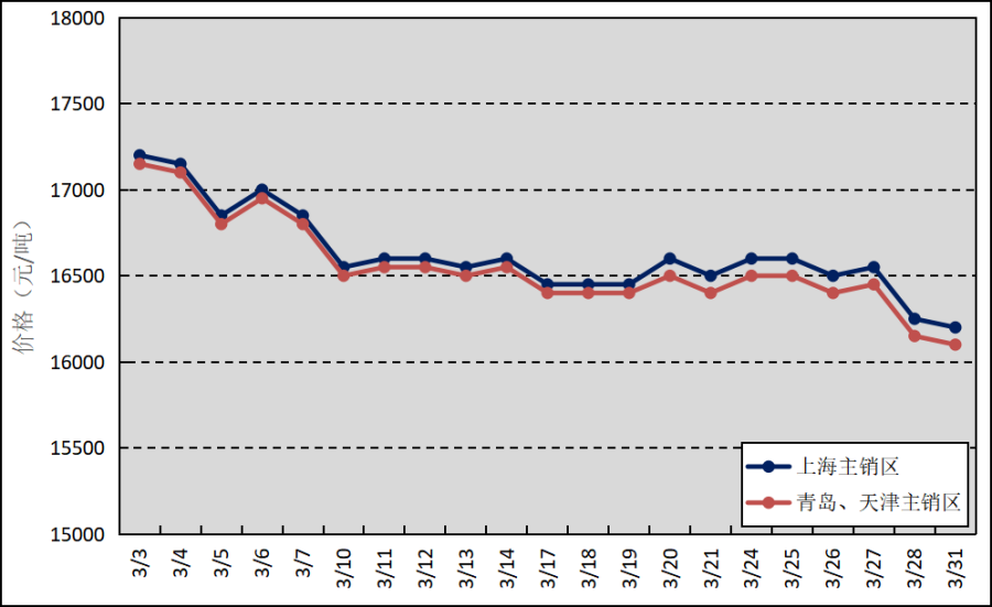 國(guó)內(nèi)主銷區(qū):3月,國(guó)產(chǎn)全乳標(biāo)準(zhǔn)膠上海市場(chǎng)平均價(jià)格16624元/噸,環(huán)比下跌462元/噸,最高價(jià)為17200元/噸,最低價(jià)為16200元/噸;青島市場(chǎng)和天津市場(chǎng)平均價(jià)格16555元/噸,環(huán)比下跌448元/噸,最高價(jià)為17150元/噸,最低價(jià)為16100元/噸。