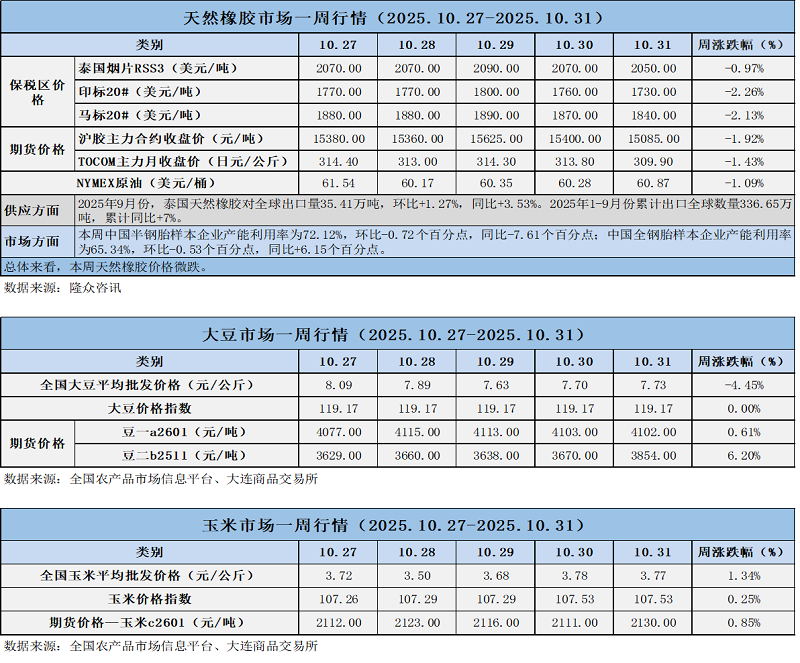 天然橡膠、大豆、玉米市場(chǎng)一周行情(2025.10.27-10.31)