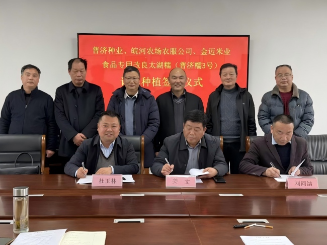 儀式上,三方代表圍繞普濟糯3號的品種特性、種植技術(shù)規(guī)范、訂單收購價格、品質(zhì)保障標(biāo)準等內(nèi)容進行深入交流并簽署了1萬畝的糯稻訂單協(xié)議。根據(jù)協(xié)議,普濟種業(yè)將提供優(yōu)質(zhì)種源與技術(shù)指導(dǎo),皖河農(nóng)場公司負責(zé)組織規(guī)?;N植與生產(chǎn)管理,金邁米業(yè)則按約定價格兜底收購,形成糧食生產(chǎn)一體化全產(chǎn)業(yè)鏈閉環(huán)。