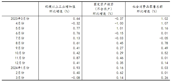 (2)根據季節(jié)調整模型自動修正結果,對近一年來各期國內生產總值、規(guī)模以上工業(yè)增加值、固定資產投資(不含農戶)、社會消費品零售總額環(huán)比增速進行修訂。修訂結果及2024年一季度GDP環(huán)比數(shù)據、2024年3月份其他指標環(huán)比數(shù)據如下: