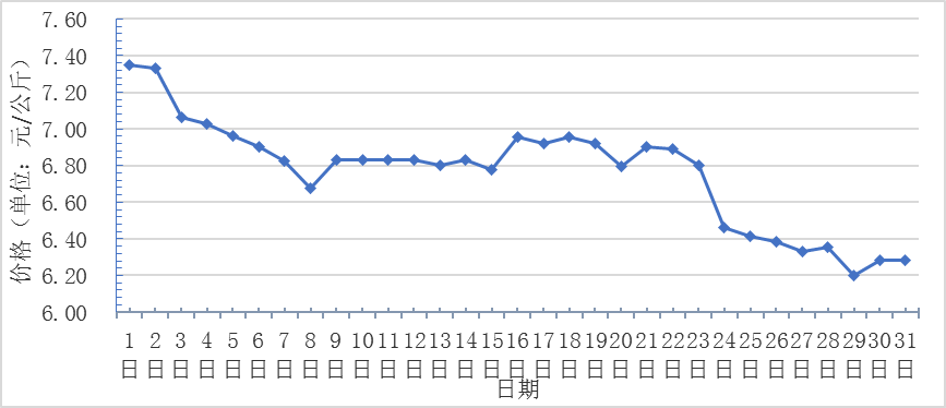 7月,全國重點監(jiān)測農(nóng)產(chǎn)品批發(fā)市場香蕉總交易量達2.1萬噸,同比上漲5%,環(huán)比下降8.7%;總交易價值 13613.1萬元,同比上漲6.5%,環(huán)比下降11.3%。日平均價格最高為7.4元/千克,最低為6.2元/千克,全月平均價格為 6.8元/千克,同比上漲23.6%,環(huán)比上漲1.5%(每日價格變化如圖)。