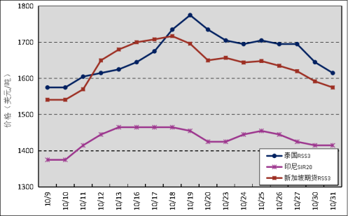 國外主產(chǎn)區(qū):10月,泰國RSS3平均價格為1666美元/噸,環(huán)比上漲83美元/噸,最高價為1775美元/噸,最低價為1575美元/噸;印尼SIR20平均價格為1434美元/噸,環(huán)比上漲39美元/噸,最高價為1465美元/噸,最低價為1375美元/噸;新加坡RSS3期貨主力合約月均結(jié)算價格為1637美元/噸,環(huán)比上漲73美元/噸,最高價為1717美元/噸,最低價為1541美元/噸。