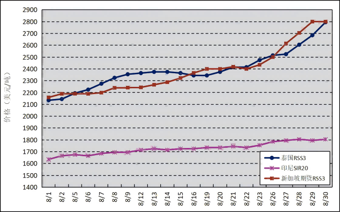 國外主產(chǎn)區(qū):8月,泰國RSS3平均價格為2392美元/噸,環(huán)比上漲680美元/噸,最高價為2795美元/噸,最低價為2135美元/噸;印尼SIR20平均價格為1728美元/噸,環(huán)比上漲103美元/噸,最高價為1805美元/噸,最低價為1635美元/噸;新加坡RSS3期貨主力合約月均結(jié)算價格為2380美元/噸,環(huán)比上漲293美元/噸,最高價為2800美元/噸,最低價為2159美元/噸。