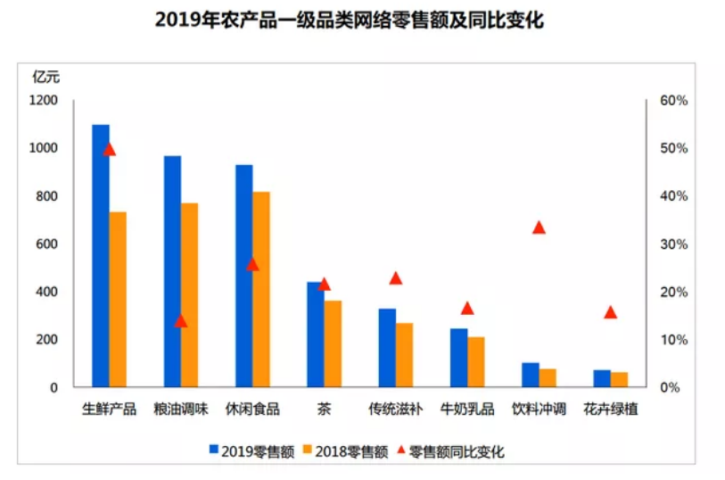 近日,在農(nóng)業(yè)農(nóng)村部市場與信息化司的指導與支持下,中國農(nóng)業(yè)科學院農(nóng)業(yè)信息研究所發(fā)布《中國農(nóng)產(chǎn)品網(wǎng)絡零售市場暨重點單品分析報告》(以下簡稱《報告》)。報告針對全國農(nóng)產(chǎn)品網(wǎng)絡零售市場進行分析,其中2019年生鮮產(chǎn)品網(wǎng)絡零售額突破1094.9億元,成為農(nóng)產(chǎn)品上行第一大品類,網(wǎng)絡零售量同比增加78.4%。