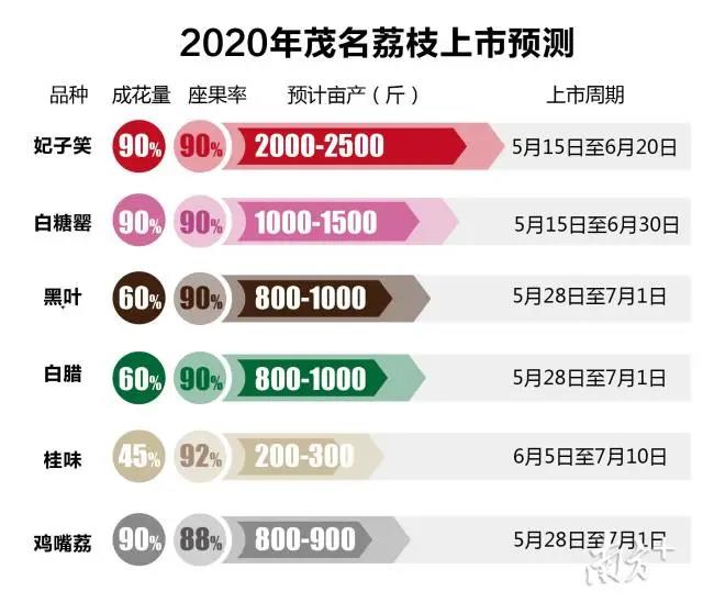 數(shù)據(jù)顯示,茂名有荔枝種植面積135.5萬畝,其中,電白區(qū)有36.1萬畝,高州市有55.8萬畝,化州市有24.8萬畝,信宜市有13.5萬畝,茂南區(qū)有5.2萬畝。今年妃子笑成花量約90%,預(yù)計畝產(chǎn)可達(dá)2000-2500斤,上市周期為5月15日至6月20日;白糖罌成花量約90%,預(yù)計畝產(chǎn)可達(dá)1000-1500斤,上市周期為5月15日至6月30日;黑葉和白臘成花量均在60%左右,預(yù)計畝產(chǎn)可達(dá)800-1000斤,上市周期為5月28日至7月1日;桂味成花量約30%,預(yù)計畝產(chǎn)200-300斤,上市周期為6月5日至7月10日。