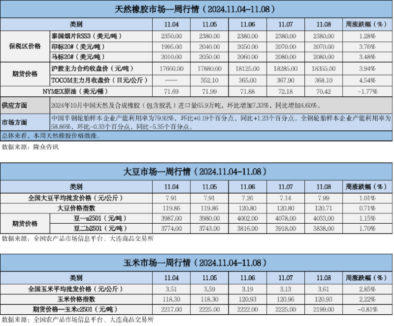 天然橡膠、大豆、玉米市場一周行情(2024.11.04-11.08)