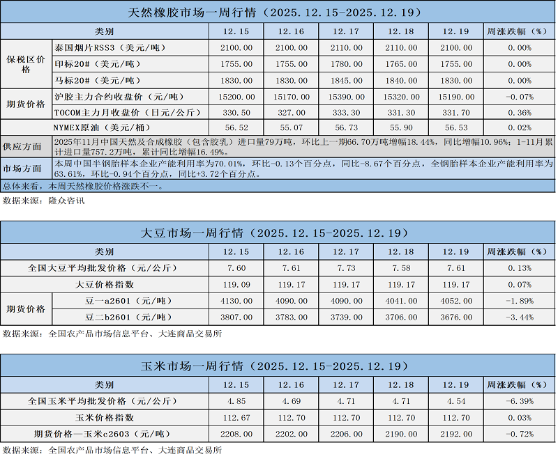 天然橡膠、大豆、玉米市場(chǎng)一周行情(2025.12.15-12.19)
