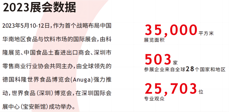 由德國科隆世界食品博覽會(huì)(Anuga)強(qiáng)力推動(dòng),科隆展覽、中國食品土畜進(jìn)出口商會(huì)、深圳市零售商業(yè)行業(yè)協(xié)會(huì)共同主辦,ANUFOOD China 2023世界食品(深圳)博覽會(huì)于2023年5月10-12日在深圳國際會(huì)展中心(寶安新館)順利舉辦。本屆展會(huì)累計(jì)吸引25,703位食飲行業(yè)人士觀展,展覽總面積達(dá)到35,000平方米,參展企業(yè)數(shù)量達(dá)503家,來自全球近30個(gè)國家和地區(qū),涵蓋甜食及休閑食品、肉類、乳制品、精細(xì)食品、海產(chǎn)及冷凍食品、植物基及健康食品、咖啡與茶、飲料(酒精與非酒精)、食品與飲料技術(shù)、餐飲服務(wù)與技術(shù)等食品與飲料全產(chǎn)業(yè)鏈。同期還舉辦歐洲最大的烘焙咖啡行業(yè)盛會(huì)SIGEP在華子展——SIGEP China深圳國際手工冰淇淋、烘焙及咖啡展覽會(huì)。