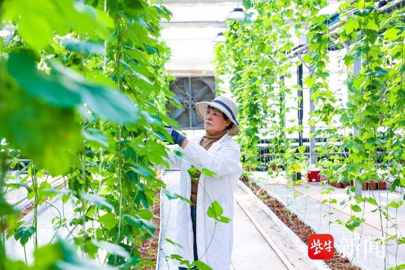 與此同時(shí),在云臺(tái)農(nóng)場(chǎng)興墾科技的現(xiàn)代智能玻璃溫室大棚里,另一種特色經(jīng)濟(jì)作物正蓬勃生長(zhǎng)——啤酒花。一株株啤酒花順著吊蔓繩向上攀爬。這里采用了國(guó)內(nèi)領(lǐng)先的無(wú)土栽培模式,以粗細(xì)椰糠為基質(zhì),配合空氣源溫控、漫散射玻璃、水肥一體化滴灌等先進(jìn)技術(shù),精準(zhǔn)復(fù)刻并優(yōu)化了啤酒花的理想生長(zhǎng)環(huán)境。