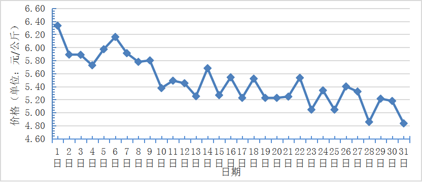 7月,全國重點監(jiān)測農產品批發(fā)市場香蕉總交易量達2.2萬噸,同比下降4.3%,環(huán)比上漲4.8%;總交易價值11932.6萬元,同比下降6.4%,環(huán)比下降2.8%。日平均價格最高為6.3元/千克,最低為4.8元/千克,全月平均價格為 5.5元/千克,同比下降6.7%,環(huán)比下降14.1%(每日價格變化如圖)。