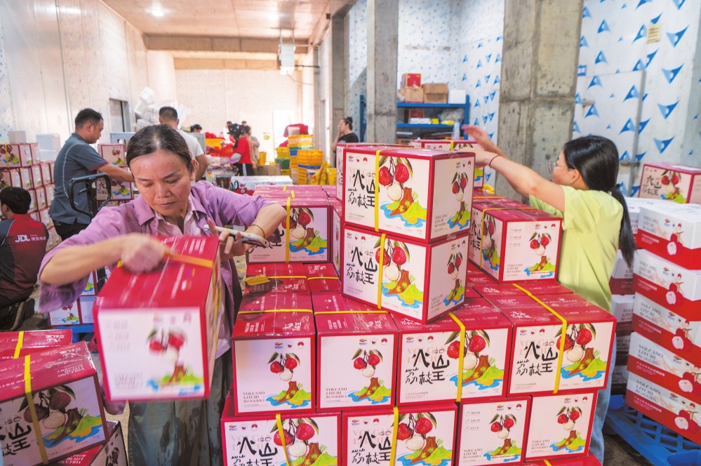 近日,在??诨鹕嚼笾Ψ謷行模ぷ魅藛T正打包新鮮采摘的火山荔枝王。本報(bào)記者 石中華 攝