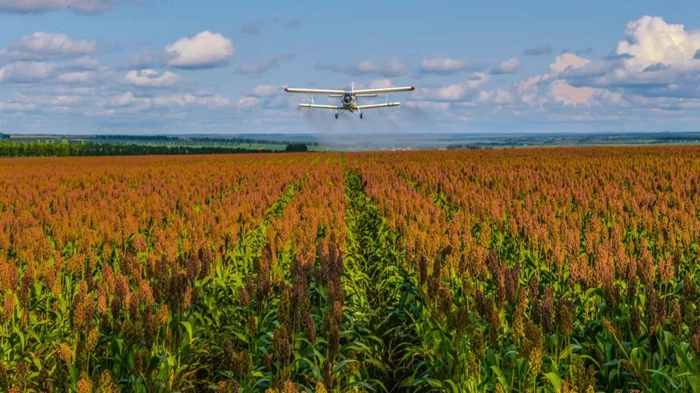 《插上科技的翅膀》 北大荒農(nóng)墾集團(tuán)九三分公司鶴山農(nóng)場飛機(jī)植保作業(yè)。岳靜華 攝