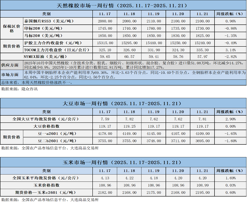 天然橡膠、大豆、玉米市場(chǎng)一周行情(2025.11.17-11.21)
