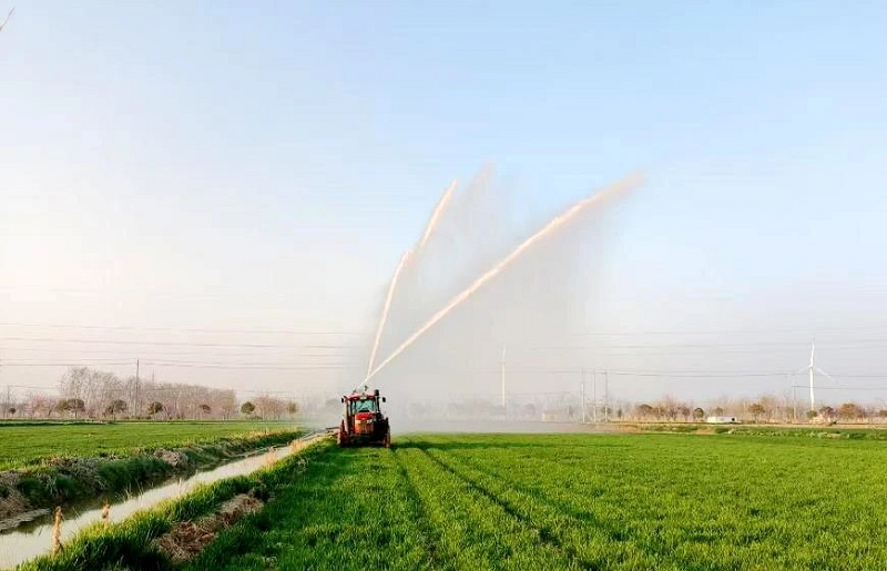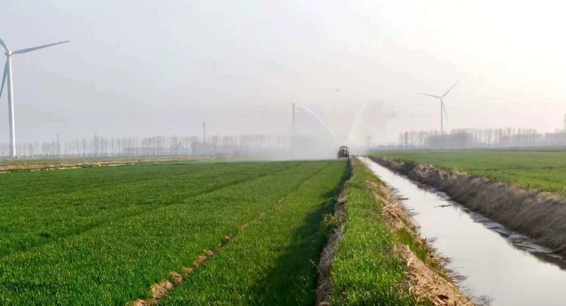 為確保稻茬麥的豐產(chǎn)穩(wěn)產(chǎn),六生產(chǎn)區(qū)迅速行動(dòng),迅速組織職工召開緊急會(huì)議,制定了一套科學(xué)合理的抗旱保苗方案——采取噴灌的方式,灑一塊噴一塊的方案,減少肥水供應(yīng)間的時(shí)間窗口,增加水肥利用率,實(shí)現(xiàn)水分與養(yǎng)分的精準(zhǔn)供應(yīng),有效提高作業(yè)效率。采用噴灌與撒肥同步進(jìn)行的方式,開啟晝夜搶灌作業(yè),全力保障農(nóng)作物生長所需水分與養(yǎng)分。
