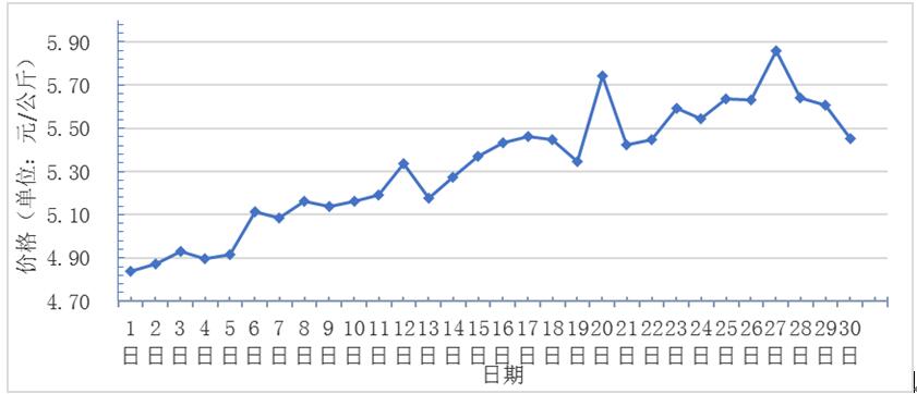 11月,全國(guó)重點(diǎn)監(jiān)測(cè)農(nóng)產(chǎn)品批發(fā)市場(chǎng)香蕉總交易量達(dá)9萬(wàn)噸,同比上漲8.4%,環(huán)比下降2.2%;總交易價(jià)值 48607.5萬(wàn)元,同比上漲35.1%,環(huán)比上漲14.1%。日平均價(jià)格最高為5.9元/千克,最低為4.8元/千克,全月平均價(jià)格為5.3元/千克,同比上漲12.8%,環(huán)比上漲6%(每日價(jià)格變化如圖)。