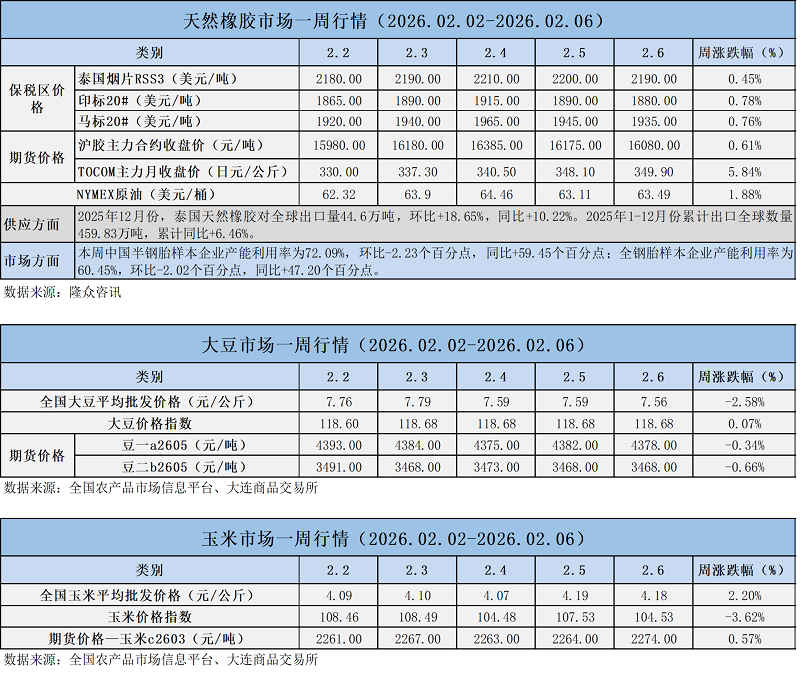 天然橡膠、大豆、玉米市場一周行情(2026.02.02-02.06)