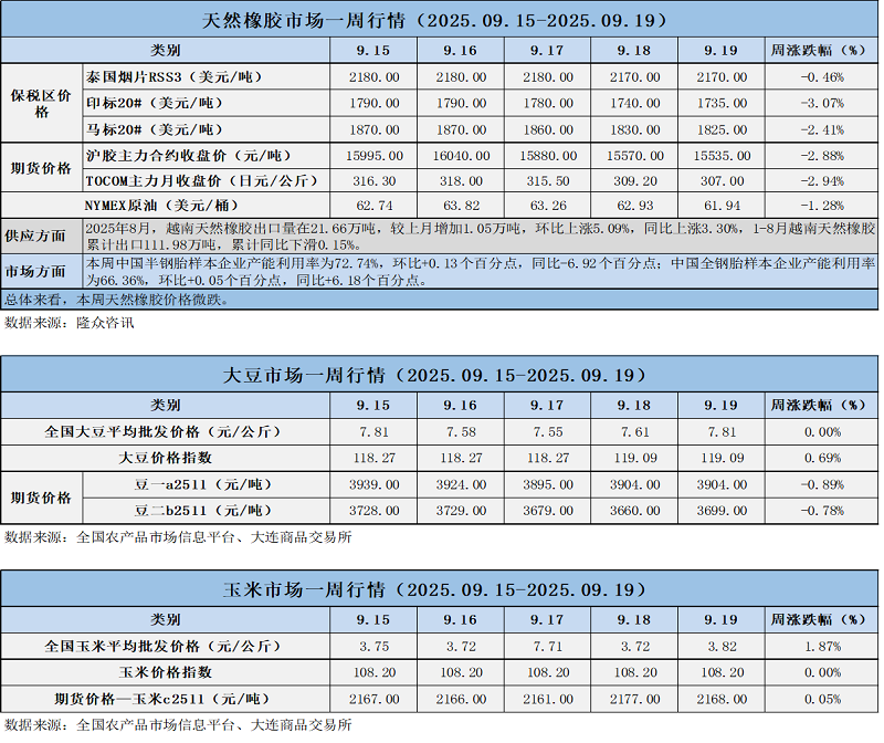 天然橡膠、大豆、玉米市場一周行情(2025.09.15-09.19)