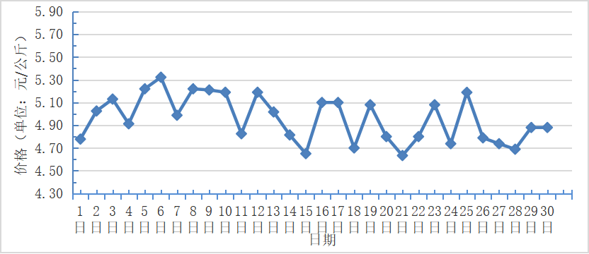 9月,全國重點監(jiān)測農(nóng)產(chǎn)品批發(fā)市場香蕉總交易量達2.2萬噸,同比上漲4.80%,環(huán)比下降4.3%;總交易價值12518.2萬元,同比下降9.1%,環(huán)比上漲6.1%。日平均價格最高為5.3元/千克,最低為4.7元/千克,全月平均價格為 5.0元/千克,同比下降25.4%,環(huán)比基本持平(每日價格變化如圖)。