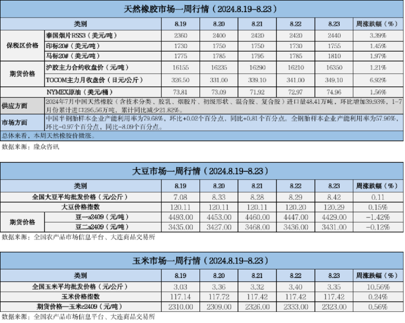 天然橡膠、大豆、玉米市場一周行情(2024.08.16-08.23)