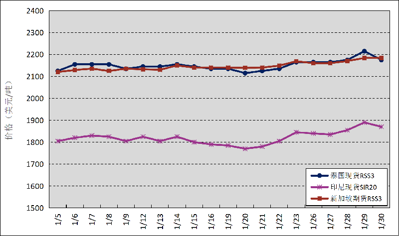 國外主產(chǎn)區(qū):1月,國外主產(chǎn)區(qū)價(jià)格整體小幅上揚(yáng)。其中,泰國3號(hào)煙片膠(RSS3)平均價(jià)格2151美元/噸,環(huán)比增加80美元/噸,最高價(jià)2215美元/噸,最低價(jià)2115美元/噸;印尼20號(hào)標(biāo)準(zhǔn)膠(SIR20)平均價(jià)格1820美元/噸,環(huán)比增加100美元/噸,最高價(jià)1890美元/噸,最低價(jià)1770美元/噸。