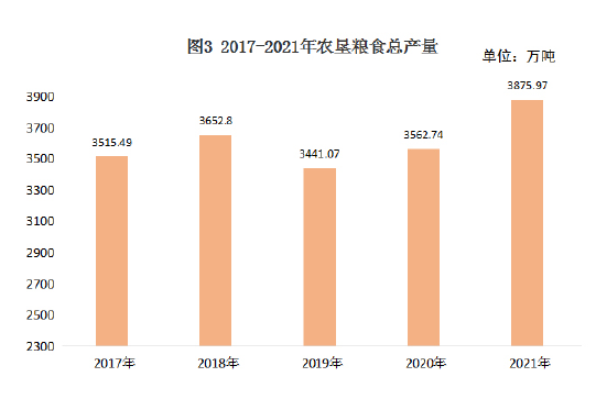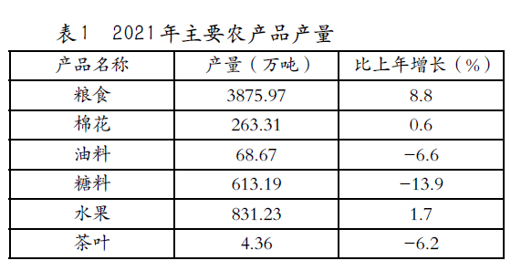 糧食總產(chǎn)量3875.97萬(wàn)噸,比上年增加313.23萬(wàn)噸,增長(zhǎng)8.8%(見圖3)。主要農(nóng)產(chǎn)品產(chǎn)量見表1。