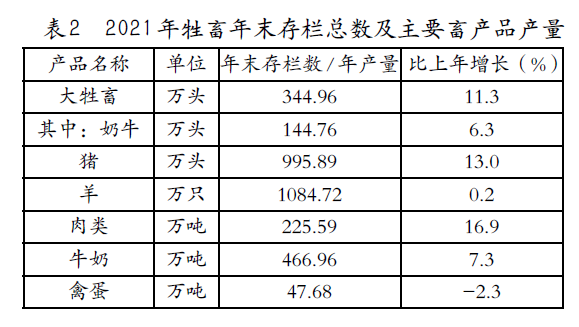 畜牧業(yè)占農(nóng)林牧漁業(yè)總產(chǎn)值比重21.6%,比上年減少1.3個(gè)百分點(diǎn)。牲畜年末存欄總數(shù)及主要畜產(chǎn)品產(chǎn)量見表2。