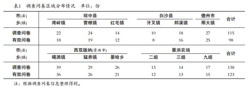 為避免膠農(nóng)對調(diào)查問卷中問題專業(yè)說法不理解,提高問卷質(zhì)量,本文調(diào)查形式主要采用“一對一”問答形式,由被調(diào)查者回答問題,調(diào)查者填寫問卷,對每個(gè)問題詳細(xì)詢問,能夠真正了解膠農(nóng)天然橡膠生產(chǎn)情況。問卷的調(diào)查方式主要是天然橡膠種植區(qū)域聚集地挨戶走訪、收膠點(diǎn)隨機(jī)抽樣調(diào)查、膠園地頭隨機(jī)抽樣調(diào)查。共填寫調(diào)查問卷253份,其中有效調(diào)查問卷為221份,問卷有效率為87.4%。調(diào)查問卷區(qū)域分布情況見表1。
