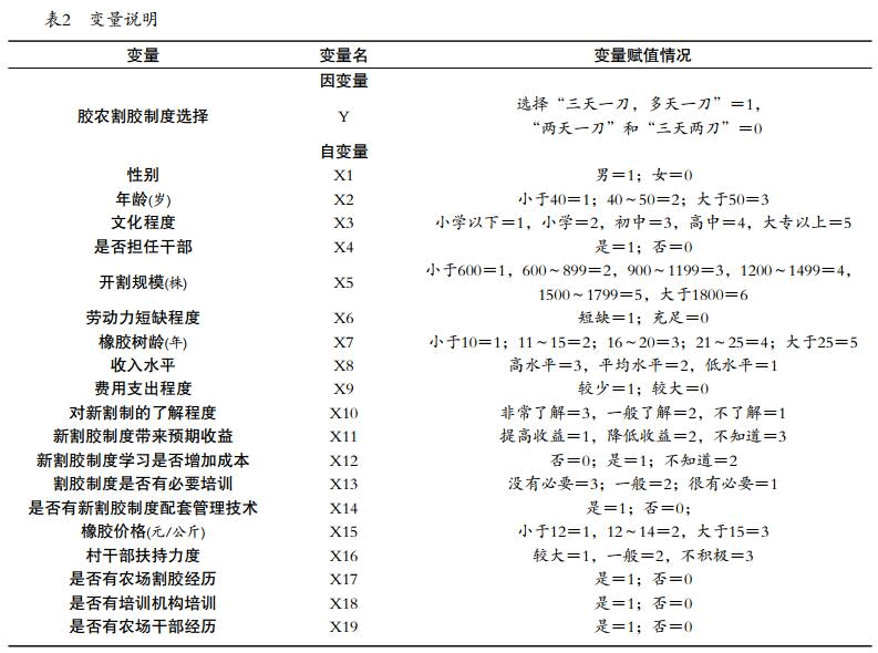 設(shè)計(jì)問卷調(diào)查表,實(shí)地調(diào)查膠農(nóng)對橡膠割制選 擇行為,分別對海南儋州白沙、瓊中、瓊海,云南西雙版納等地選取不同植膠水平的農(nóng)村進(jìn)行隨機(jī)抽樣調(diào)查,具體變量說明見表2。