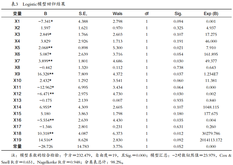 利用微觀調(diào)研數(shù)據(jù),從農(nóng)戶自身特征、家庭特征、割膠制度認(rèn)知特征、天然橡膠市場、基層組織環(huán)境角度的分析結(jié)果,對膠農(nóng)選擇割膠制度存在一定影響,本節(jié)從計(jì)量數(shù)學(xué)方法上分析民營膠農(nóng)選擇割膠制度的影響因素。二元Logistic模型是線性回歸逐漸發(fā)展的產(chǎn)物,當(dāng)被解釋變量、解釋變量中存在0/1二值品質(zhì)型變量時(shí),一般線性回歸模型不能夠滿足回歸分析,繼而選擇二元Logistic回歸模型。本文以我國民營膠農(nóng)割膠制度選擇情況為因變量,影響膠農(nóng)割膠制度選擇的變量為自變量,二元Logistic模型適合本文研究。
