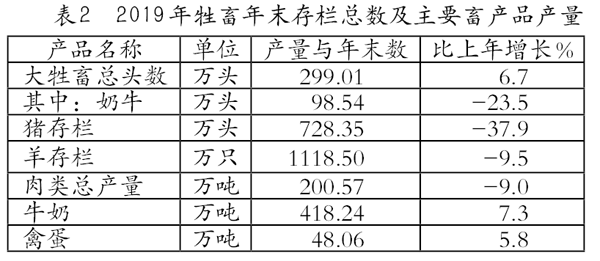 畜牧業(yè)占農(nóng)業(yè)總產(chǎn)值比重23.0%,比上年增長(zhǎng)2.6個(gè)百分點(diǎn)。牲畜年末存欄總數(shù)及主要畜產(chǎn)品產(chǎn)量見表2。