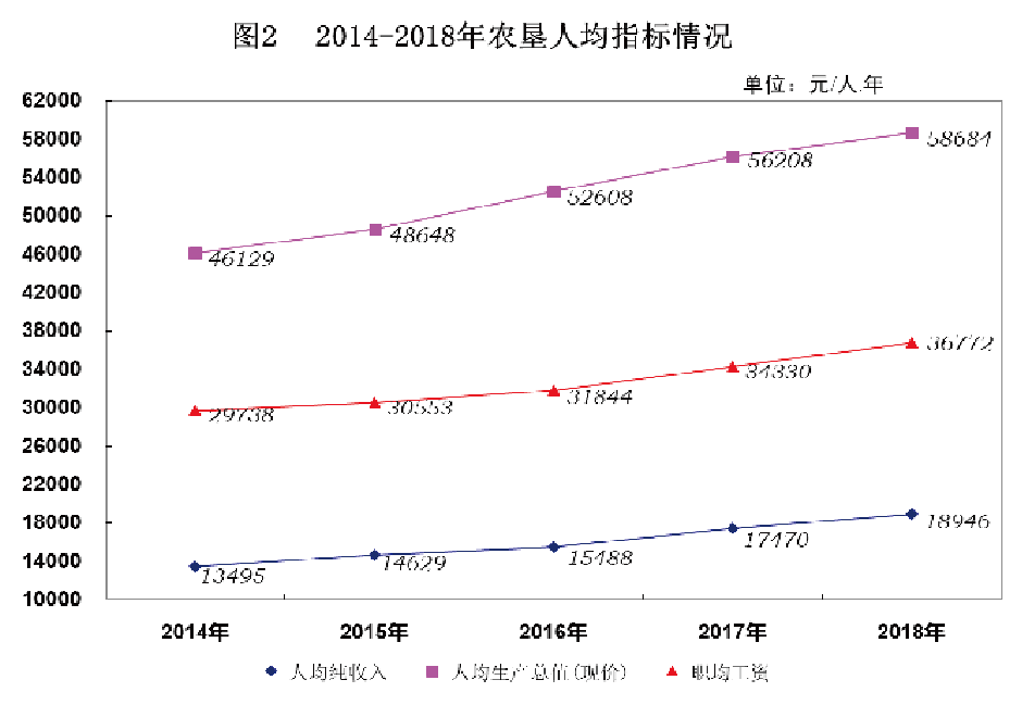 全年農(nóng)墾經(jīng)濟(jì)實(shí)現(xiàn)生產(chǎn)總值8157.20億元(見圖1)。其中,第一產(chǎn)業(yè)增加值1887.75億元;第二產(chǎn)業(yè)增加值3516.68億元;第三產(chǎn)業(yè)增加值2752.77億元。第一、第二、第三產(chǎn)業(yè)增加值占農(nóng)墾生產(chǎn)總值的比重分別為23.1%、43.1%和33.7%。人均生產(chǎn)總值58684元;人均純收入持續(xù)增長,達(dá)到18946元,比上年增長8.4%(見圖2)。